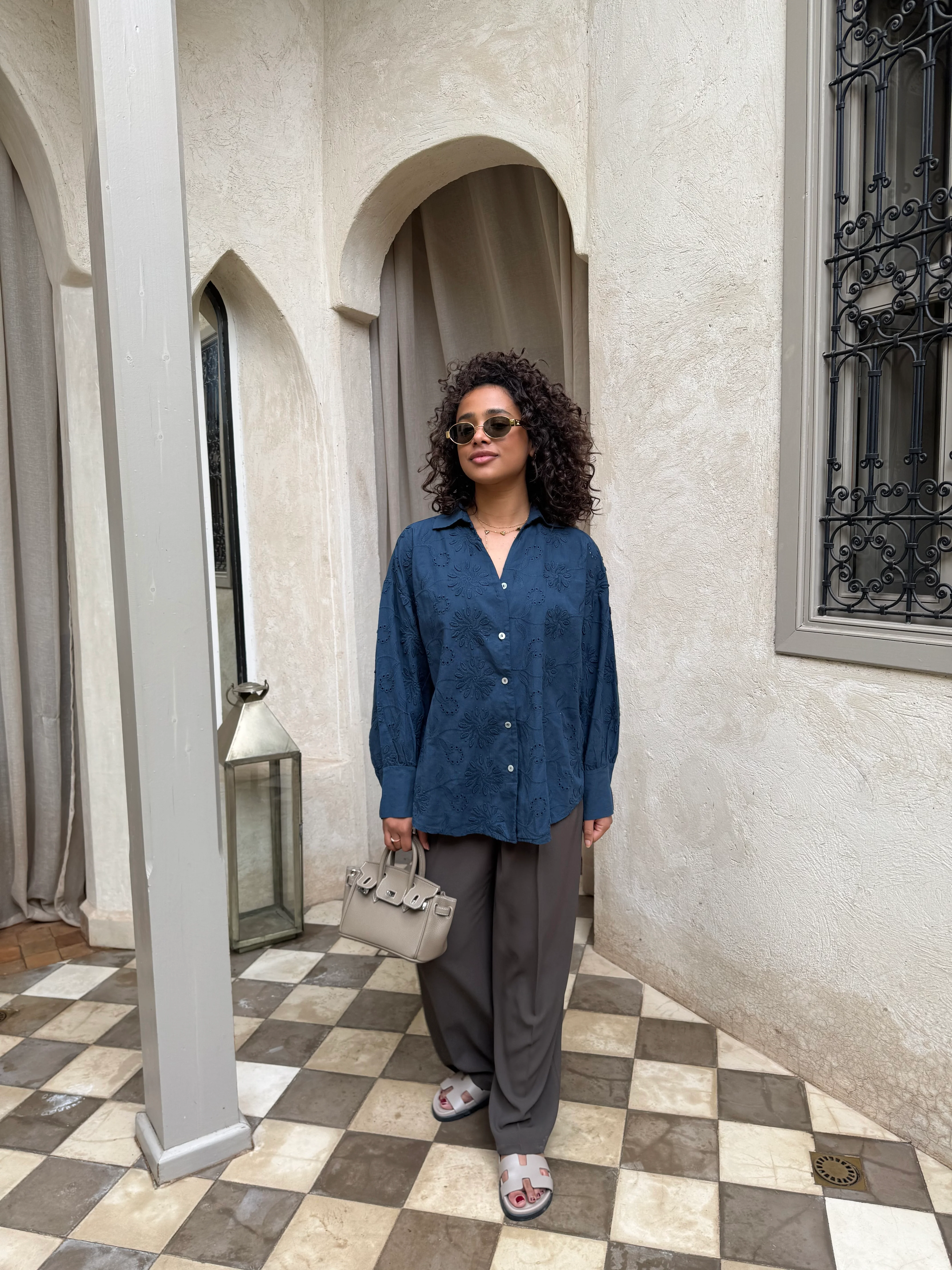 Chemise en taille unique, non doublée. Le mannequin mesure 1m65.